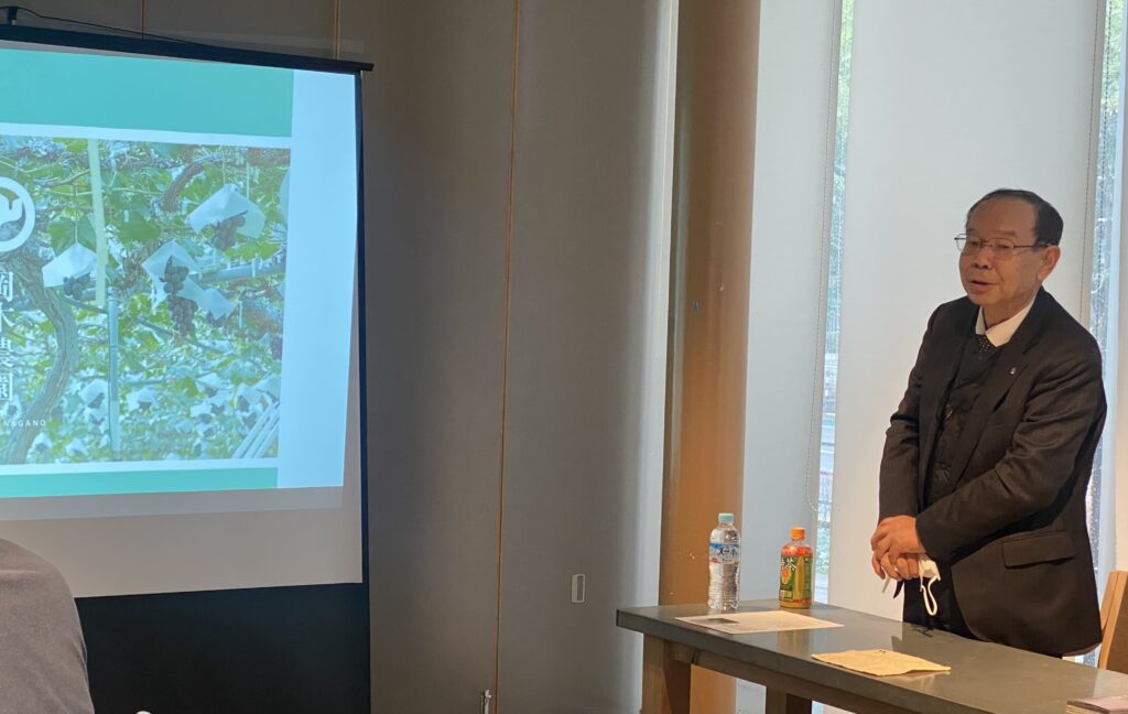 岡木農園代表・岡木由行様よりご挨拶をいただき、農園での取り組みやぶどうづくりへのこだわりについて、映像を交えながらご紹介いただきました。理想の品質を目指して日々努力を重ねている様子が伝わり、参加者にとって理解を深める機会となりました。